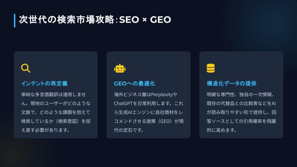 特に近年は従来のSEOに加え、GEO(Generative Engine Optimization:生成AI検索最適化)への対応が不可欠になっています。海外のビジネス層は、情報収集にPerplexityやChatGPTの検索機能を日常的に使用しています。